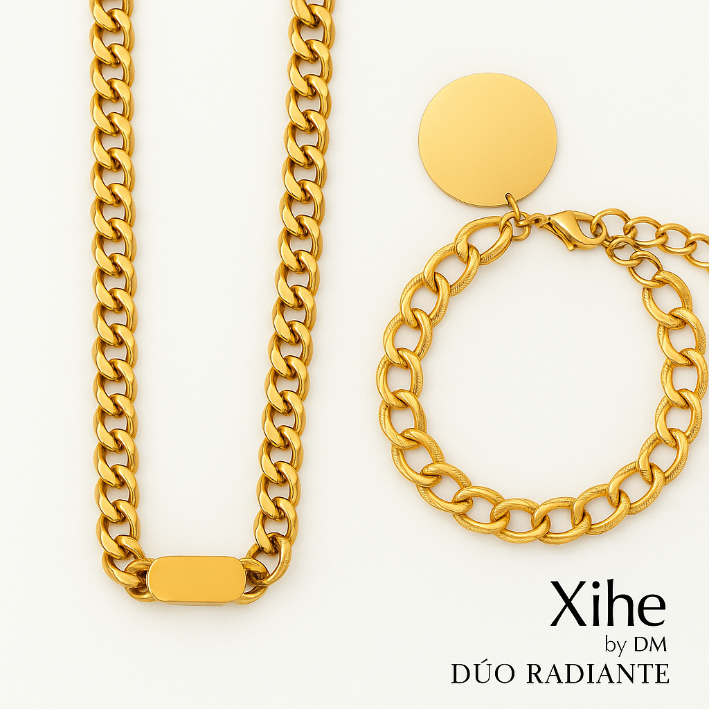 Un set protagonista: brillo intenso del dorado para elevar cualquier look. El Duo Radiante ofrece un brillo intenso en tonos dorados que realza cualquier estilo con un toque de elegancia fresca y moderna. Perfecto para quienes buscan destacar con accesorios que iluminan y elevan su look diario.
