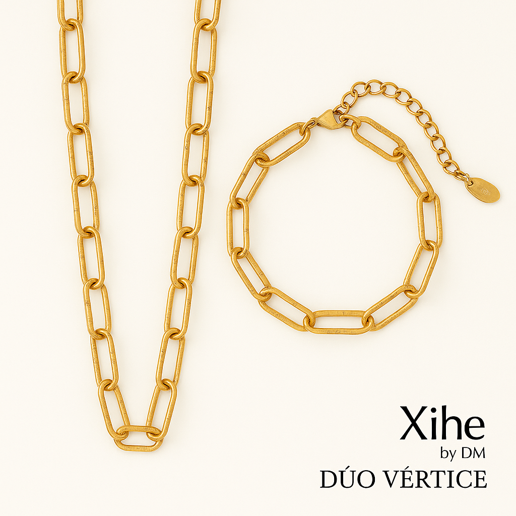 El Dúo Vértice ofrece un brillo intenso en dorado que realza cualquier estilo con un toque moderno y fresco. Perfecto para mujeres que buscan añadir un detalle brillante y elegante a su look cotidiano o especial. Este set versátil es ideal para destacar con sencillez y sofisticación.